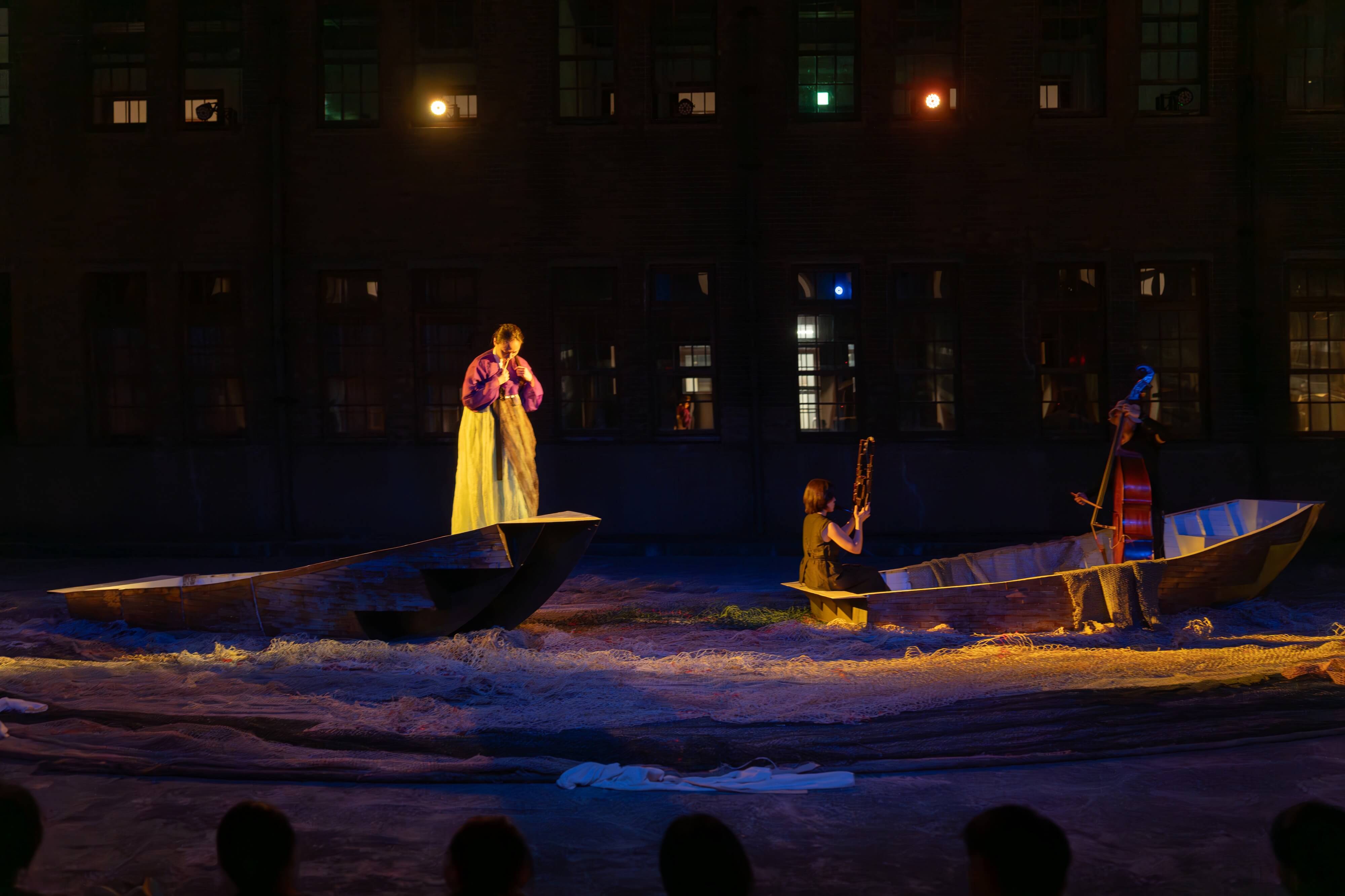 賴彥勳、李東熙、林佩儒《海潮・舟潮・離》於正濱舊漁會大樓演出現場(表演者:李佳芝;笙簧:韓智秀 Ji-Su Han)。(攝影|劉耀鈞)