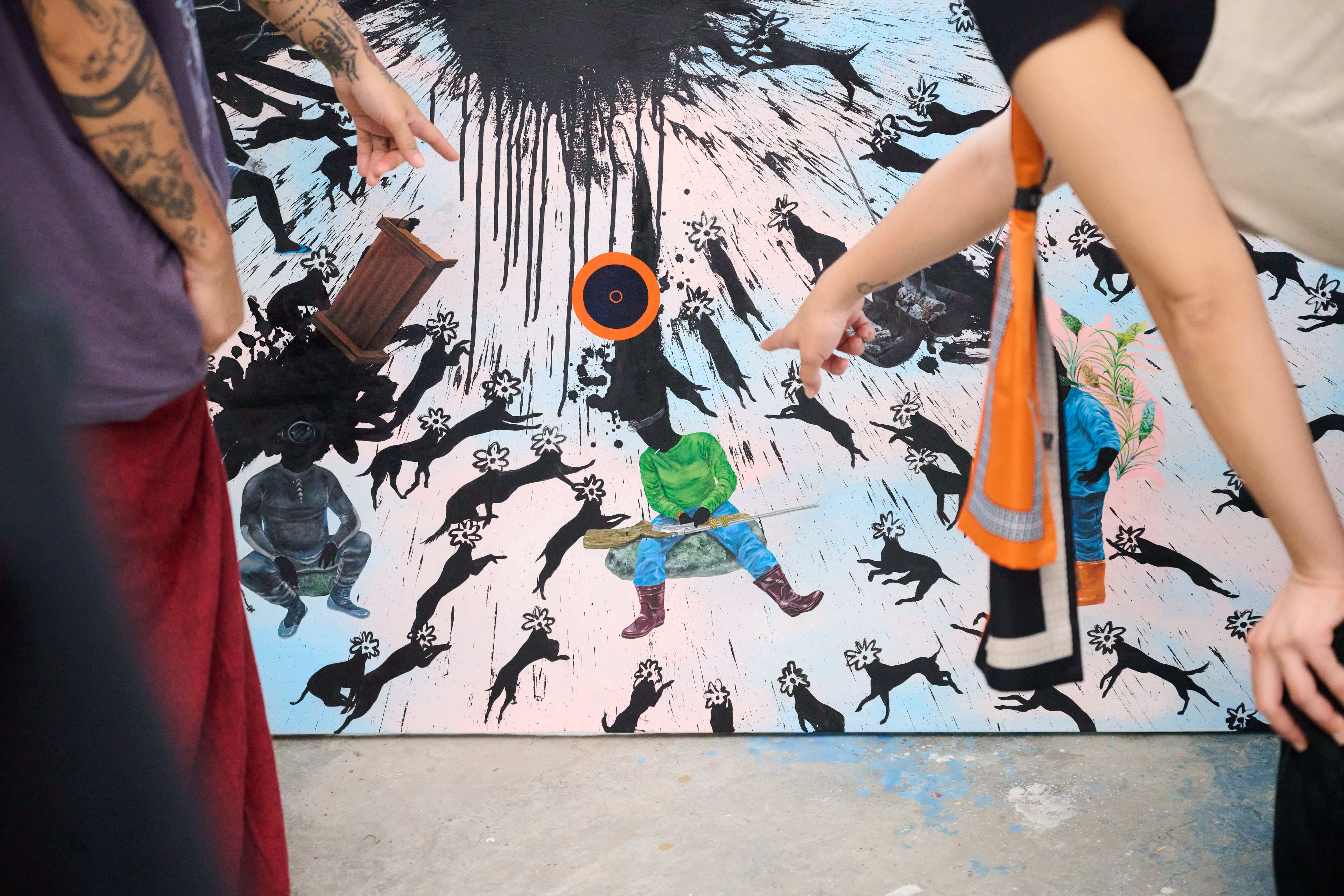 事實上,這項創作似乎也提問了作為「一半」泰雅族人的自己。她自述,在成長過程中,常常有身分認同的矛盾,這份困惑具體會反映在她重複出現的夢境中:一個深藍色的夜晚,一群穿梭在山林的獵狗向她撲倒,在她的身上不停地嗅,找尋她「只有一半」的靈魂。這場關於靈魂的追尋,在創作實踐中找到了出口。Yabun將「爆破」系列作品中,以射擊方式顯影繪製的花卉圖案,視為打破固有界線的象徵,同時隱喻著她對自我與文化的重構。其他作品如《枷鎖幾斤重》則是一名獵人揹著一隻山豬,對她而言,到山上亦是一種歸零。《Yabun在路上》,則是呈現三名穿著傳統服、和服與全身赤裸的泰雅女性,提問著原住民族歷經日本殖民、宗教殖民等枷鎖,如何才能回歸到真正的自己?Yabun坦言,她拿起獵槍進入山林,在部落中還是有些男性會排斥女性入山,但他先生始終給她很多的支持,而在藝術創作的過程中,她彷彿也是拿著獵槍來對自己進行再次校準、歸零,重新決定自己想成為什麼樣的人。