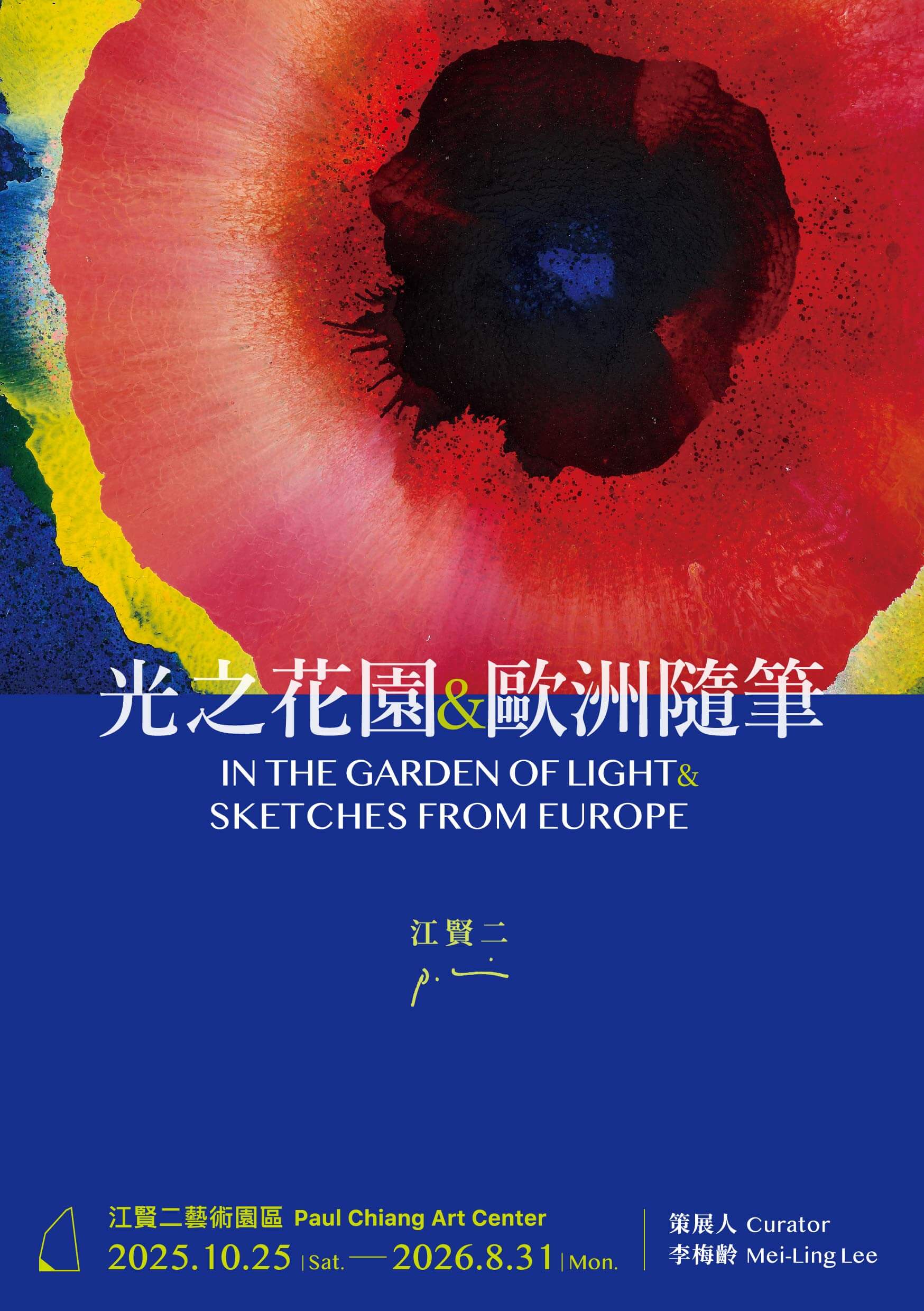 新展由園區榮譽館長、前亞洲大學現代美術館館長李梅齡策展,集結江賢二於台東、巴黎與里斯本創作的系列—《歐洲隨筆》、《光之花園》、《爵士/金樽》,以及為花蓮923而作的〈對永恆的冥想〉等。