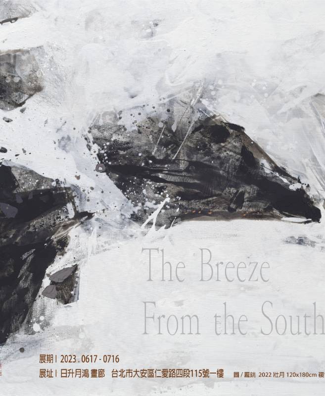 情境、意境或者造境,向來是東方傳統美學的重要課題,意即創作者取材雖多從現實而來,卻不拘泥於此一現實;相反地,往往自出機杼地打破既有的主客與時空關係,運用各種可能的藝術手法使象外之象得以不斷地增生疊加,進而形成一種動與靜、現實與想像之間迂迴反覆的對話,來烘托出個人心靈深處的絮語獨白。故龎銚此次展覽以「薰風自南來」為題,不僅清晰地傳達其在過去兩年的心緒變化,她更巧妙地以二十四節氣為靈感,重新找到與自然連結的途徑。在展出的多數作品中,都能見到她刻意選用黑、白、灰等中性色彩的壓克力顏料,透過迅疾筆觸的反覆塗抹堆疊,建構出時而輕盈時而凝重的畫面主體,隨即在經意或不經意間以金、銀、銅等提色,使得水火風土等充滿變化的自然現象,偶爾也有一些似乎可供辨認指涉的點景物件,不但讓具象與非具象二者的元素得到各自發揮又相互輝映的視覺效果,也隱約地將自然四時流轉放進畫面之中,充分體現了晉孫綽〈遊天台賦〉「渾萬象以冥觀,兀同體於自然」一句的真諦。