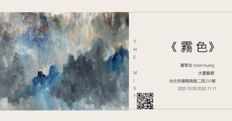 中國文化大學推廣教育部藝術文創中心|大夏藝廊 【霧色 】 The Mist ——黃琴文油畫個展 霧色 The Mist 展期 日期:2025-10-30 ~ 2025-11-11 地點 台北市大安區建國南路二段231號/ 大夏藝廊_特展區 相關連結 畫展官網 參展藝術家 黃琴文 本油畫個展以《霧.色》為名,頌詠自然的隱約之美, 畫作在形與意間流轉,以極蕳的色調和恣意的筆觸勾勒迷霧般的氛圍,構築一方沈潛的視覺之境。 畫展官網 https://egal.webnode.page 參觀時間 週一至週六9:00-21:00 週日9:00-17:00 REFERENCE 畫展官網 文化大學推廣部黃琴文大夏藝廊油畫展覽 Read More + A A A 推薦展覽 view all 板橋435藝文特區 【另一種影像實驗】煙花宇宙展覽 Endospace Exhibition 日期:2025-11-10 ~ 2025-11-24|台灣,新北市 7 days left 晴山藝術中心有限公司 【曾新耀『城 市 印 象』油畫創作個展 】 日期:2025-11-08 ~ 2025-11-29|台灣,台北市 12 days left 中國文化大學推廣教育部藝術文創中心|大夏藝廊 【-2025蠟彩增輝 蠟筆王師生聯展-】「用蠟筆彩繪」 日期:2025-10-18 ~ 2025-10-16|台灣,台北市