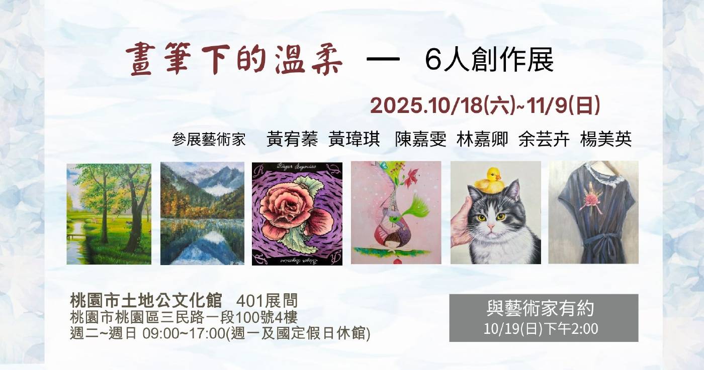 「畫筆下的溫柔—6人創作展」係結合成人教育教師:楊美英、林嘉卿、余芸卉、陳嘉雯、黃宥蓁、黃瑋琪六位教師以油彩、水彩、色鉛筆等多元繪畫媒材展現之豐富創作,筆法細膩、色彩柔和、充滿想像力,作品相互輝映,形成和諧趣味氛圍。