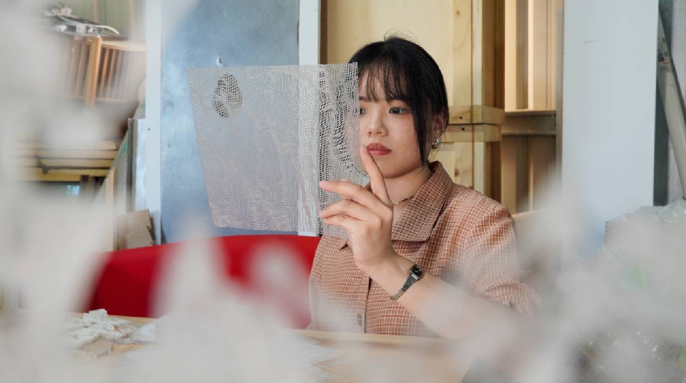 吳奕蓁,1998年生,畢業於國立臺北藝術大學,創作聚焦虛擬與現實之間的感知錯位,擅長運用3D建模、列印與數位影像等科技媒材。早期從水墨與雕塑起步,後轉向數位創作,探索身體感知與視覺邏輯的矛盾。她經常從手機相簿的日常影像出發,透過摩爾紋與像素網格轉譯記憶,創造介於真實與虛擬之間的空間。