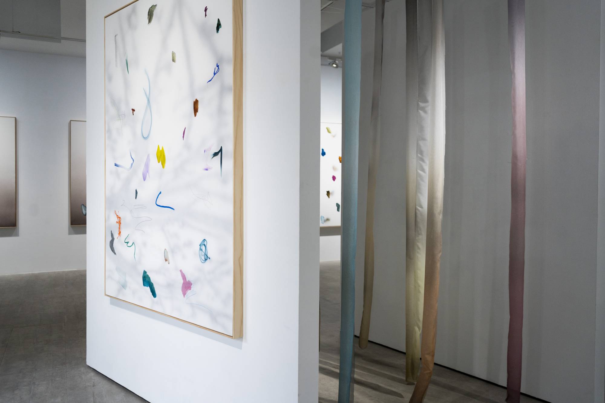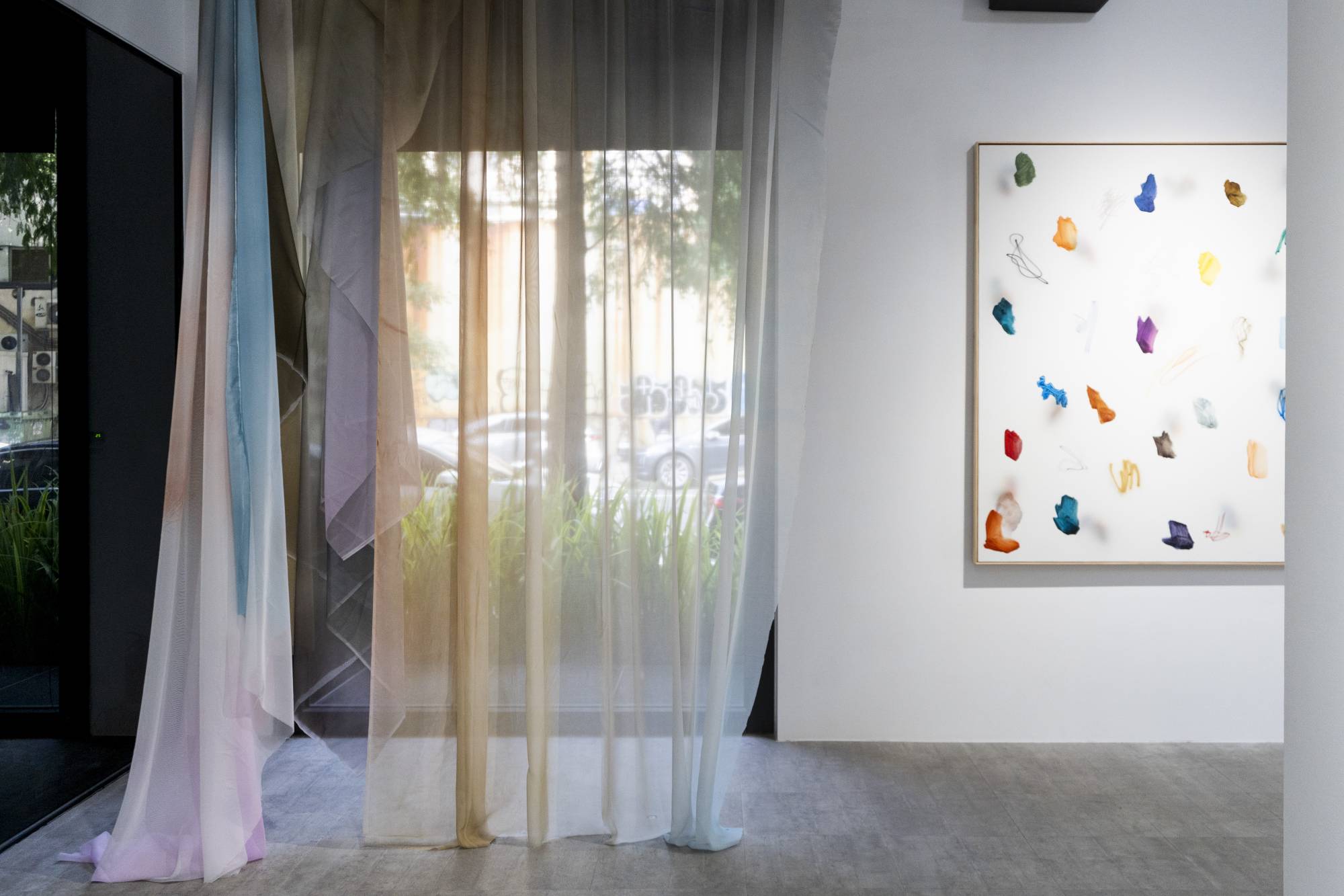 作品源自Konvalina身為舞者的身體記憶與對運動的敏感感知。漸層的抽象畫面、映照自然光的樹影,以及延伸至空間的裝置,皆在光與時間的交錯中呈現呼吸的延續與生命的脈動。展覽空間亦如一個流動的身體:層層簾幕的轉換、光影的流動與作品之間的留白,使觀者在漂浮與行走之間感受空間的呼吸。作品之間彼此呼應,與空間形成有機循環,觀看不再只是理性的觀察,而是一種身體化、情感化的經驗,使時間的延展與空間的厚度得以被具體感知,觀者在緩慢的節奏中與展覽共振。